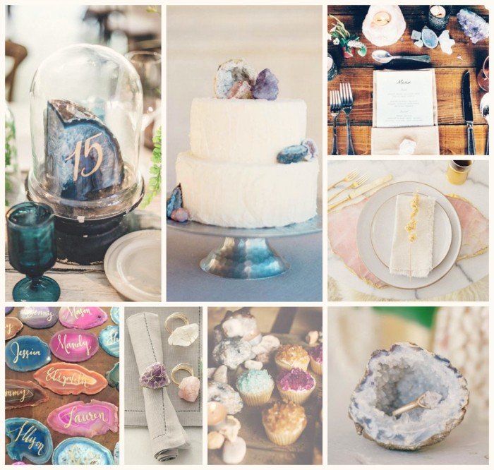 Twitterpated. That’s is the only way I can express our feelings about this current design element. Remember ‘twitterapted’ from Bambi?‘Twitterpated: To be completely enamored with something; The flighty exciting feeling you get when you think about or see the object of your affection.’That is the perfect definition to express our love of geodes and other raw gemstones, rocks and jewels. They are taking over tablescapes and design elements of weddings and we cannot get enough! From delicate details like napkin rings and jewelry to bold statements like table numbers and plate chargers, geodes are everywhere! They bring such a simplistic, natural and timeless look and feel to an already romantic evening. We are dying to design with these, who is with us!? Cupcakes | Place Setting | Table Number | Name Cards | Wedding Cake | Charger | Ring | Napkin Ring{Rachele, Sacramento Wedding Planner}