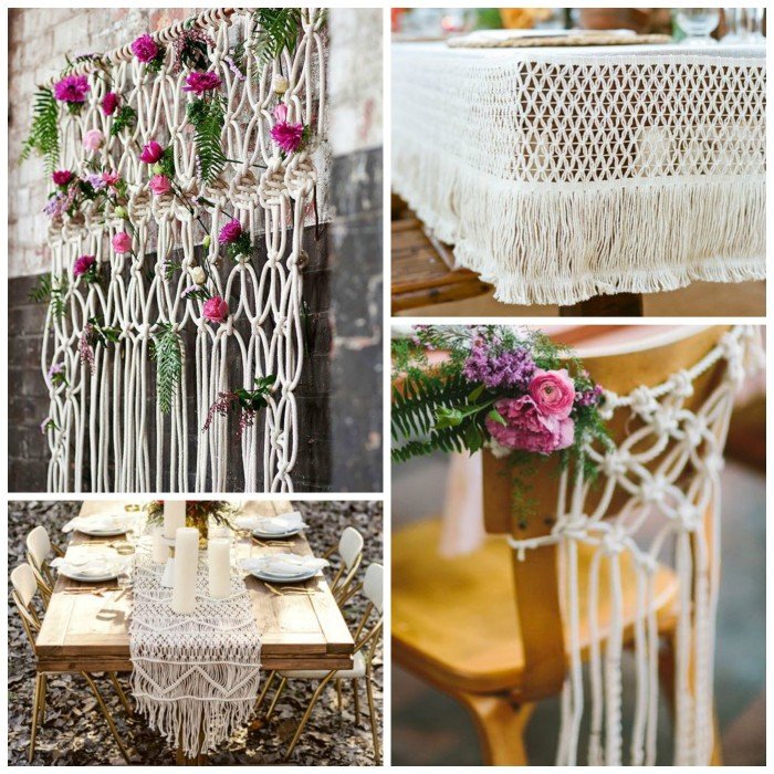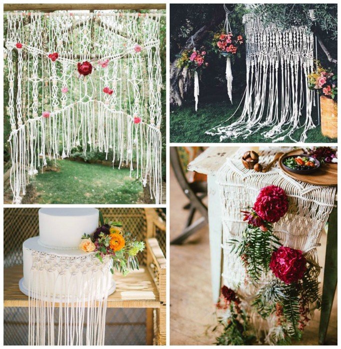 Macramé; It’s not just for your Grandma anymore! Macramé is making a major appearance at weddings and the Alluring Events and Design girls are eating it up! Talk about an inexpensive way to add some ‘wow factor’ to your event. From big back drops and installations to small detailed décor, macramé will give you the unique vibe you’re going for. Let your creative juices flow and add some fun and funky texture to your event- check out the photos below for a little inspiration.{Rachele, Sacramento Wedding Planner}Aisle Back DropTable ClothTable RunnerChair BackBack DropCeremony Back DropCakeRunner
