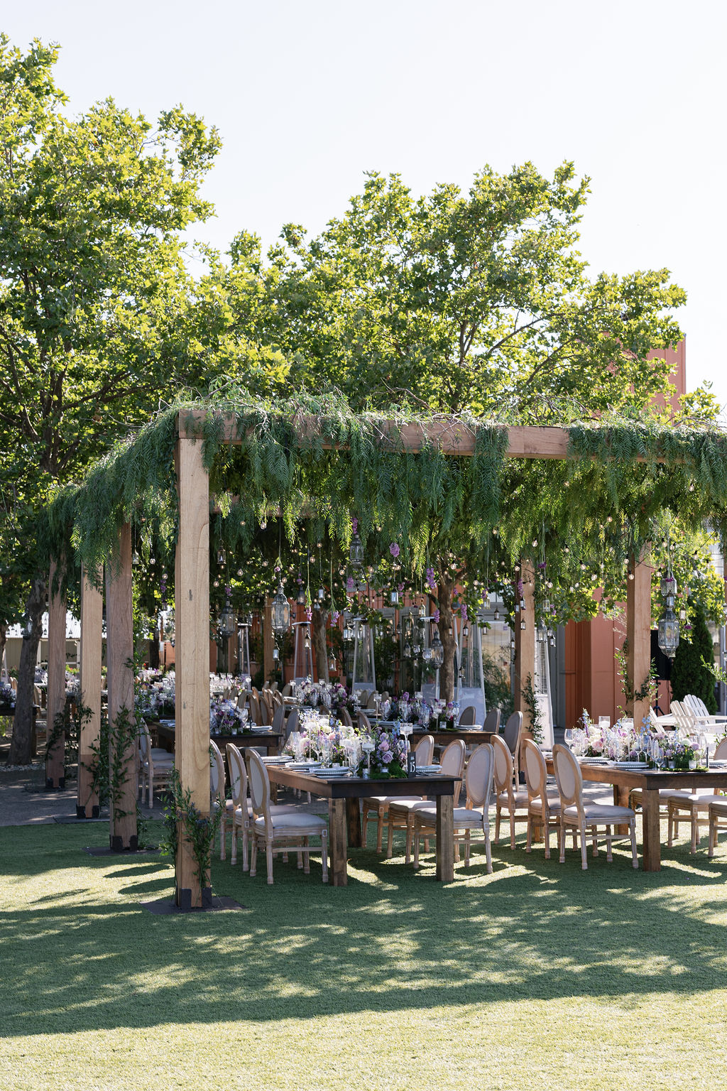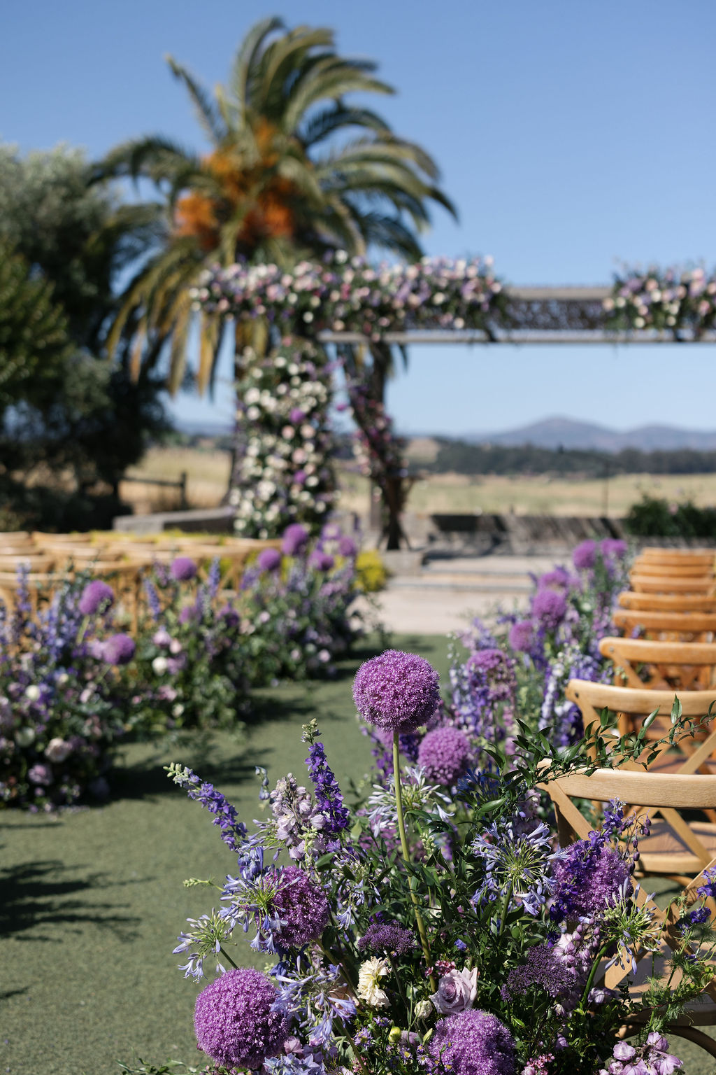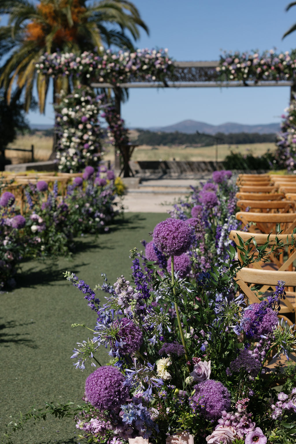 The ceremony took place on the lawn with views of endless rolling hills. Soft shades of purple added a calm elegance. Guests walked through cabanas filled with lush florals and candlelight. Every space felt peaceful and intentional.
