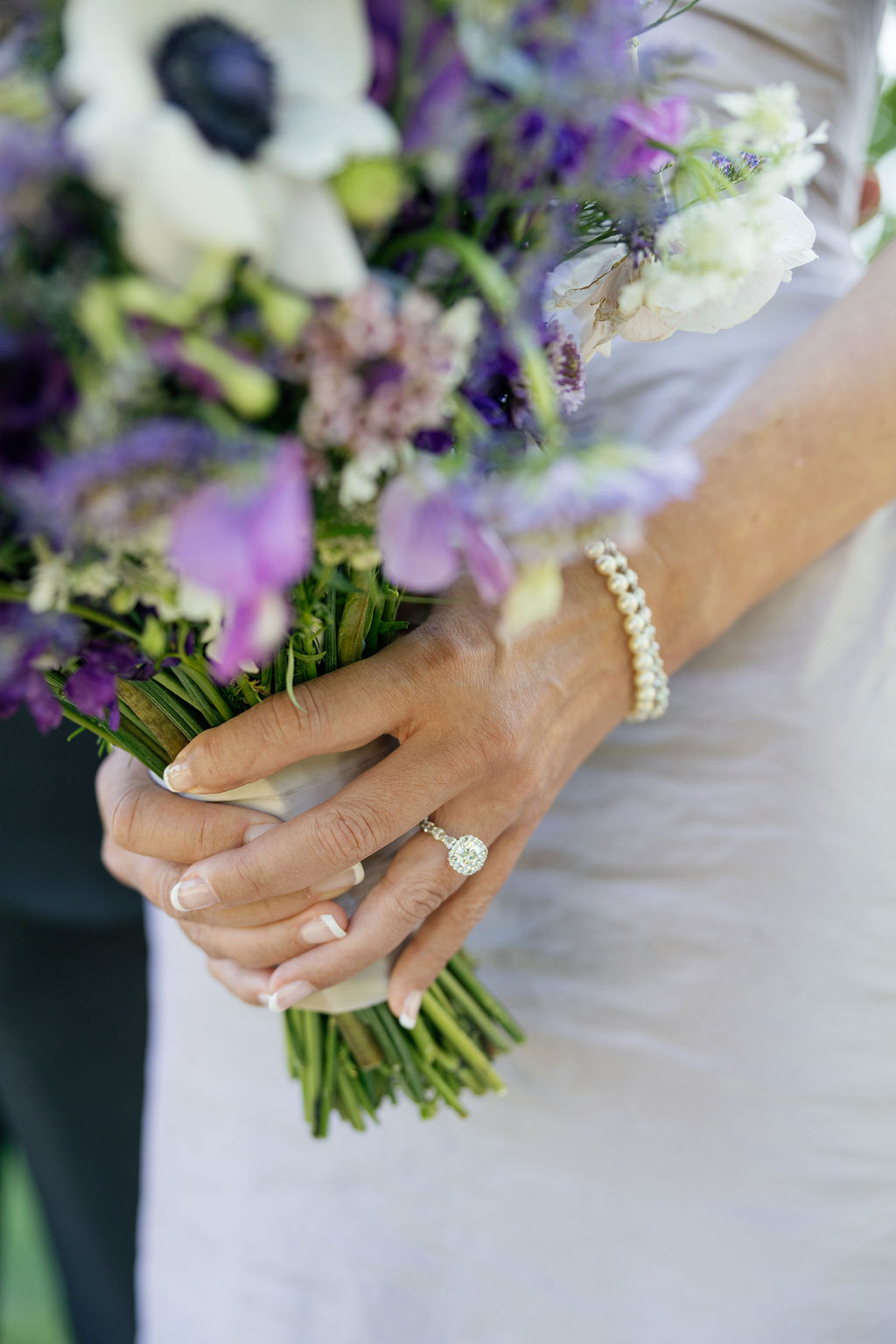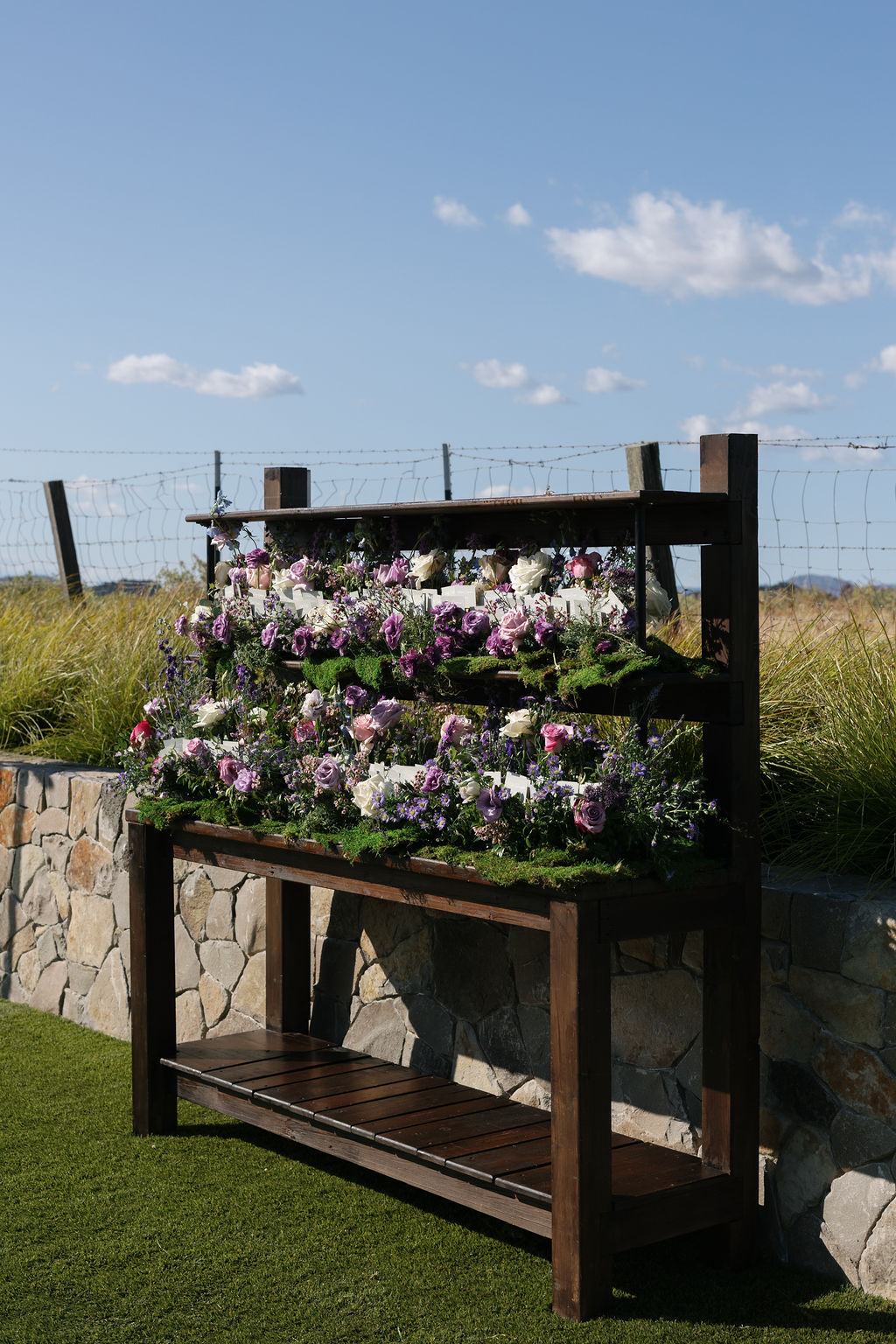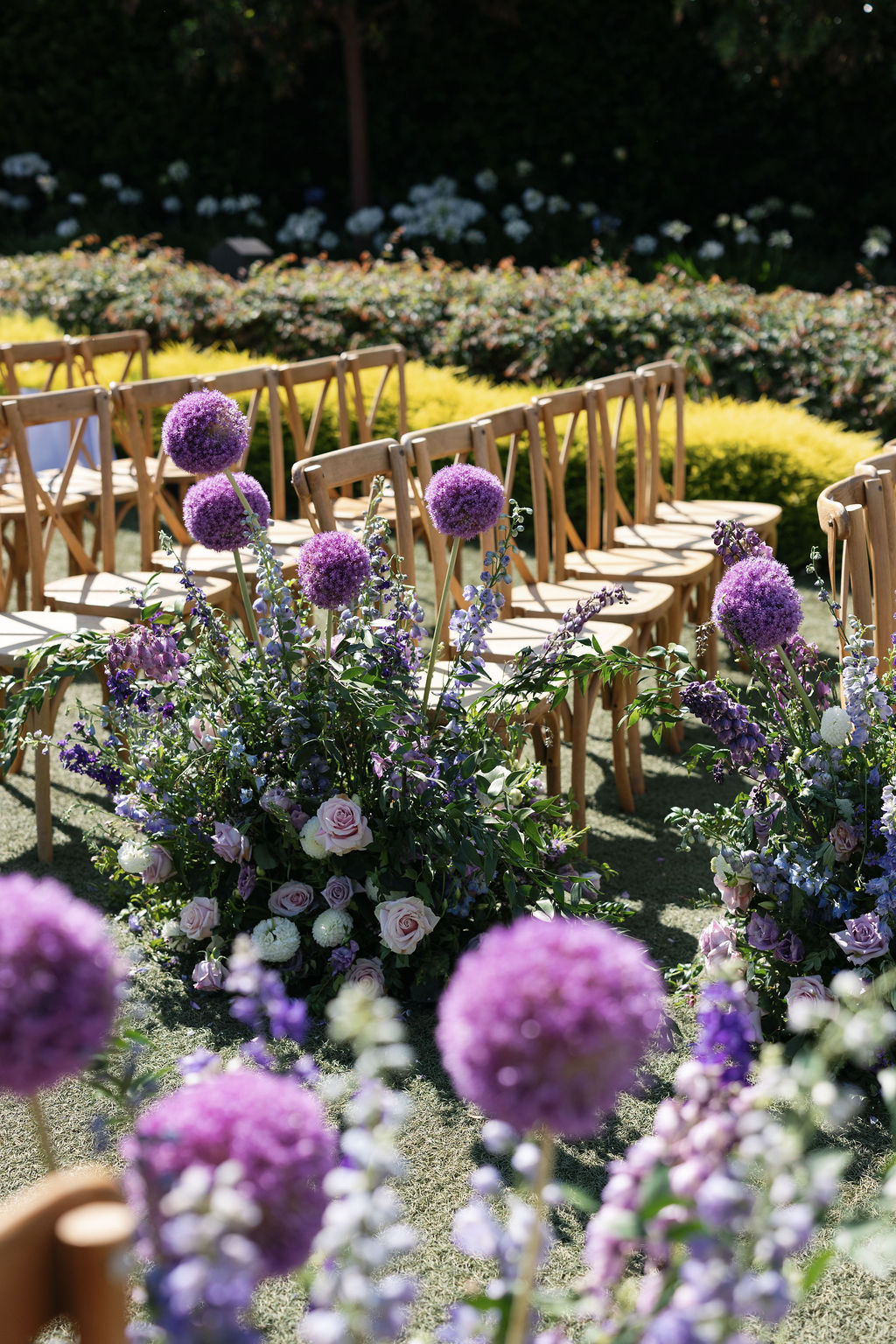 The ceremony took place on the lawn with views of endless rolling hills. Soft shades of purple added a calm elegance. Guests walked through cabanas filled with lush florals and candlelight. Every space felt peaceful and intentional.
