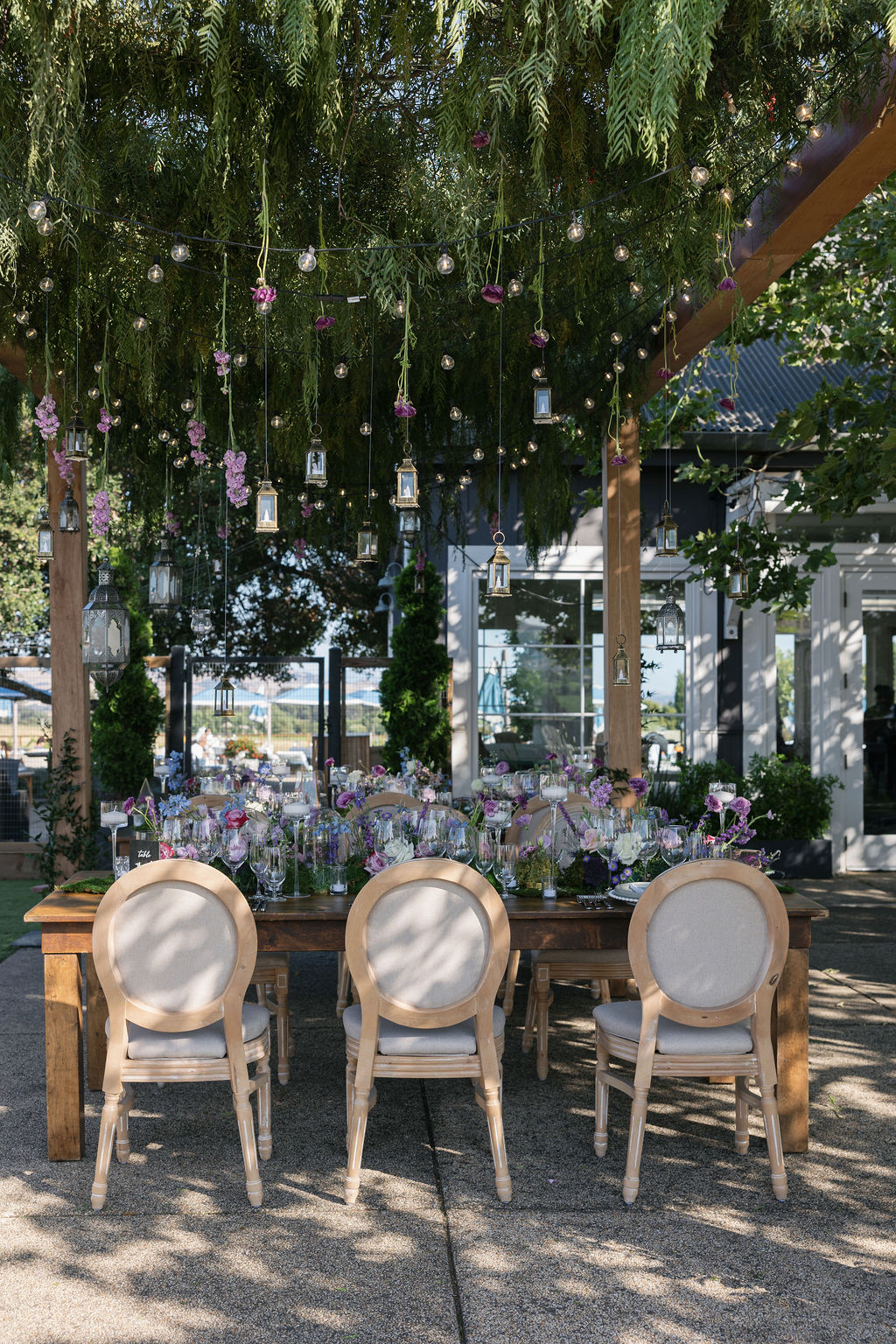 As the sun set, the reception glowed with hundreds of candles. The cabanas created intimate pockets of light that framed each table. Lavender inspired florals, gentle clusters, and flickering candles added layers of depth without overwhelming the natural setting. The design felt dreamy and light.