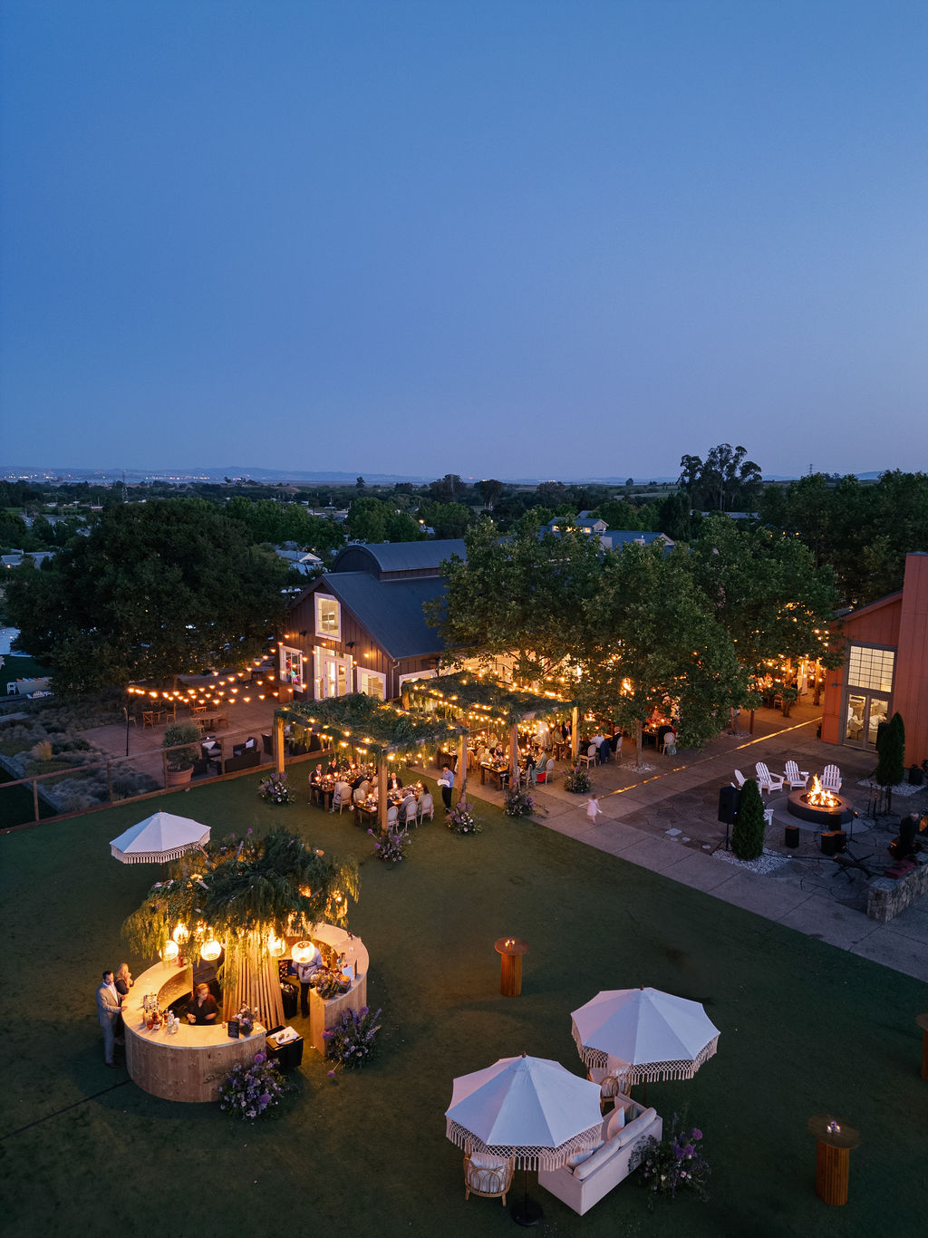 The night ended under the open sky. Guests enjoyed dinner, wine, and music as the landscape shifted from gold to deep purple. It was a celebration built around color, emotion, and a sense of ease.