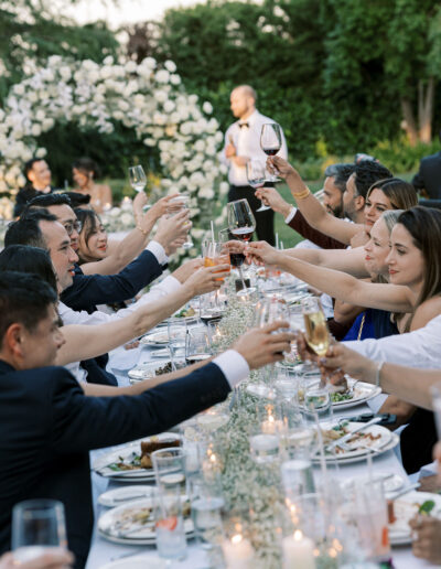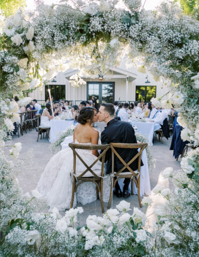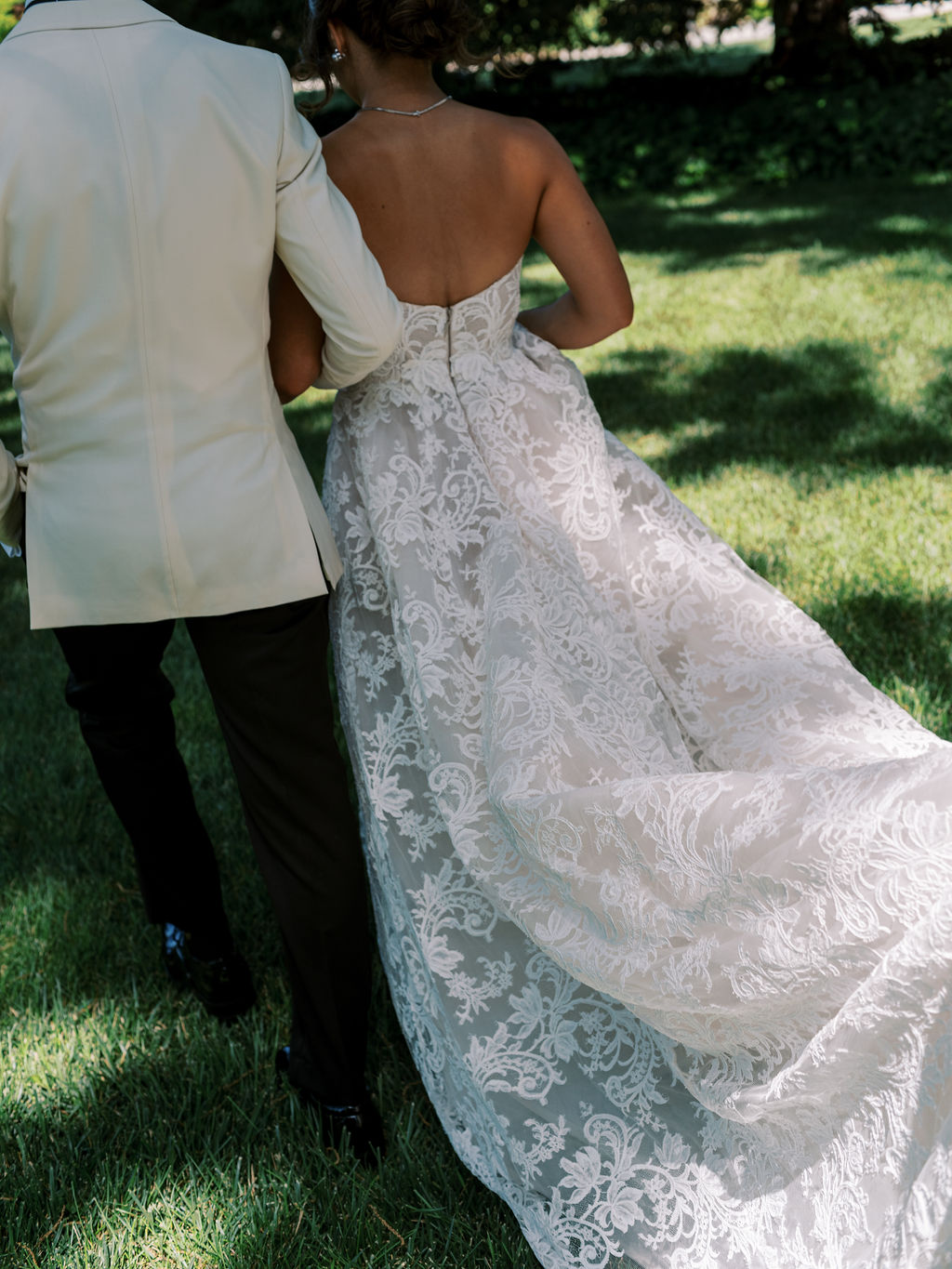 As guests transitioned into the reception, the bride changed into a second look still classic, but more tailored for a night of celebration. Her reception dress kept the refined feel, while offering a sleeker fit for dinner and dancing. Paired with a soft updo and fresh white florals, her look felt like modern bridal perfection.