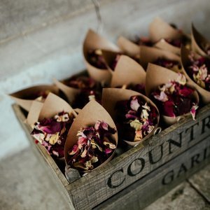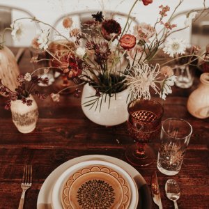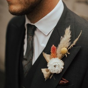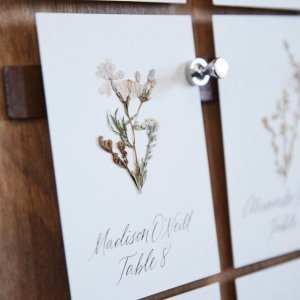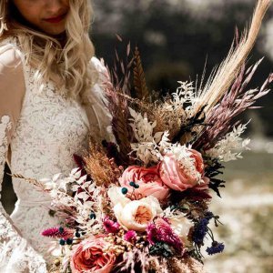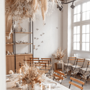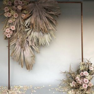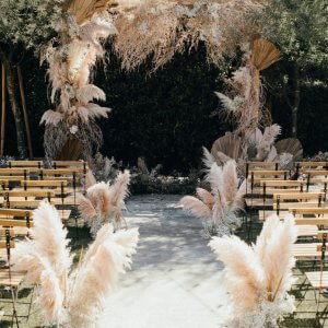 As summer transitions to autumn, we find our thoughts turning to falling leaves, oversized sweaters, and pumpkin spice. This season offers so many wonderful design elements for weddings, and one in particular that we wanted to highlight; dried flowers. Dried florals are an increasingly popular trend in weddings. Delicate and understated, dried flowers complement bohemian and rustic themes and can be featured in so many ways: boutonnières and bouquets, ceremony backdrops and reception centerpieces, seating assignments and garnished cocktails. Dried floral also makes a great addition to menu signage, table numbers, and desserts and can serve as creative ceremony confetti. Wheat, lavender, baby’s breath, and wildflowers lend themselves particularly well to dried arrangements, but roses and tropical greens have made for eye-catching installations as well. Not only do dried flowers look amazing, they’re practical. After all, if the temperature rises, they’ll be no reason to worry about your decor wilting in the heat. And you’ll automatically have professionally preserved keepsakes from your big day to admire for years to come. For a fresh, modern take, opt for fewer fresh florals on your wedding day. And look to the ladies at Alluring to help you along your way. Dried Palms | Hanging Florals | Cake | Seating Cards | Confetti | Ceremony Florals | Boutonnière | Centerpiece | Bouquet